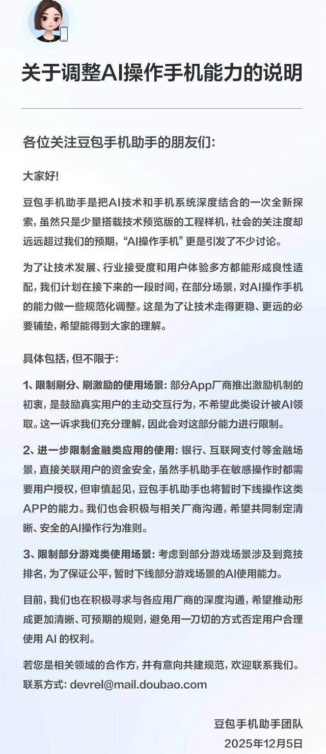 有多名网友实测发觉,闲鱼、大麦等阿里系多款使用现已“豆包手机”登录,不只无法利用AI比价等功能,以至连手动操做打开上述APP城市触发平安机制,弹出登录受阻提醒。面临各种争议,豆包接连发出声明。12月5日,豆包手机帮手发文称进一步金融类使用的利用,“银行、互联网领取等金融场景,虽然手机帮手正在操做时都需要用户授权,但审慎起见,豆包手机帮手也将临时下线操做这类APP的能力”。