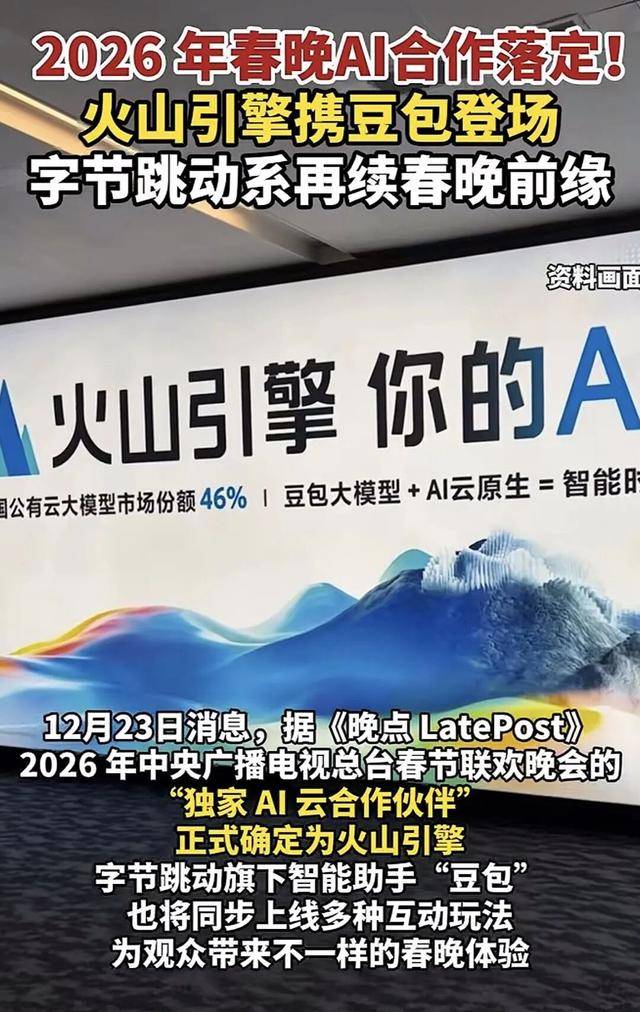 据《晚点LatePost》报道,抖音旗下火山引擎(字节跳动旗下的云办事平台)将成为2026年春晚独家AI云合做伙伴,而智能帮手豆包也将登上这个亿万人关心的国平易近舞台,带来全新互动弄法。