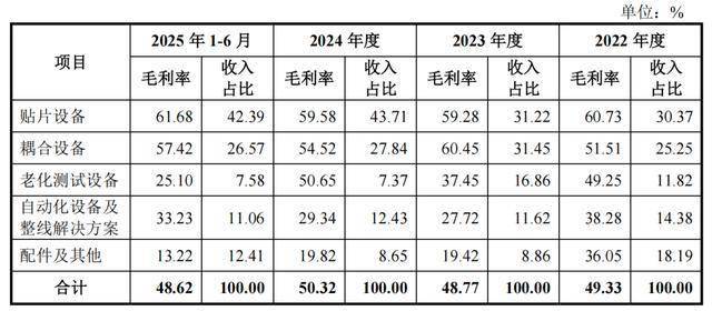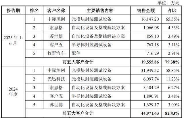 各期,猎奇智能从停业务收入中,有67。44%、79。53%、78。92%、76。54%来自贴片设备、耦合设备、老化测试设备的贡献。此中贴片设备、耦合设备发卖收入呈快速增加态势,出格是贴片设备,2023年和2024年发卖收入同比别离增加105。99%、163。27%,跨越同期99。47%、87。74%的营收增速,从停业务业绩贡献占比从2022年的30。37%增至2024年的43。71%。同时,猎奇智能逐渐向半导体行业其他范畴拓展,实现向“客户五”等射频行业出名客户批量供货,其研发的碳化硅(SiC)预烧结设备已通过士兰微验证。猎奇智能来自“客户五”的收入别离为796。02万元、3273。09万元、1890。91万元、767。18万元,次要为发卖半导体封拆测试设备。2025年2月,又取“客户五”签下了640。03万元的光模块封拆测试设备合同。各期,猎奇智能还有部门收入来自从动化设备及整线处理方案、配件及其他,不外合计收入占比从2022年的32。57%下降至2024年的21。08%。其从动化设备及整线处理方案营业次要包罗汽车、半导体、光通信等范畴的各类从动化设备,次要客户包罗索恩格、苏世博等,配件客户次要为牧野汽车。各期,猎奇智能别离有81。79%、93。17%、82。83%、79。38%的收入集中于前五大客户,取下逛光模块行业合作款式较为集中的成长示状相分歧。