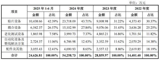 期间,中际旭创一曲位列猎奇智能第一大客户,次要采办光模块封拆测试设备,各期别离贡献57。12%、62。19%、58。85%、65。55%的发卖收入,对应金额8281。53万元、1。80亿元、3。19亿元、1。61亿元。2023年和2024年增速别离为117。17%,77。22%。2024年,中际旭创对猎奇智能采购规模增速大幅放缓40个百分点,猎奇智能营收规模增速同比下滑近12个百分点。依托取中际旭创的合做经验,猎奇智能还将设备处理方案推广至其他光模块厂商,进一步拓展市场份额,逐渐确立正在光模块封测老化设备范畴的领先地位。2024年,猎奇智能光模块贴片设备市场份额排名全球第一,光模块耦合设备市场份额排名全球第二。其光模块封拆测试设备客户还包罗光迅科技、源杰科技、陕西电子等,但取中际旭创比拟,这些客户业绩贡献规模相对无限。按照产物类别分歧,猎奇智能次要产物包罗贴片设备、耦合设备、老化测试设备、从动化设备及整线处理方案、配件及其他。此中中高精度共晶和固晶贴片设备、耦合设备和老化测试设备,笼盖光模块封拆测试流程从物理封拆到最终机能验证的多个次要焦点环节,支撑最高1。6T速度光模块的封拆需求,取中际旭创800G光模的产能扩张需求高度契合。